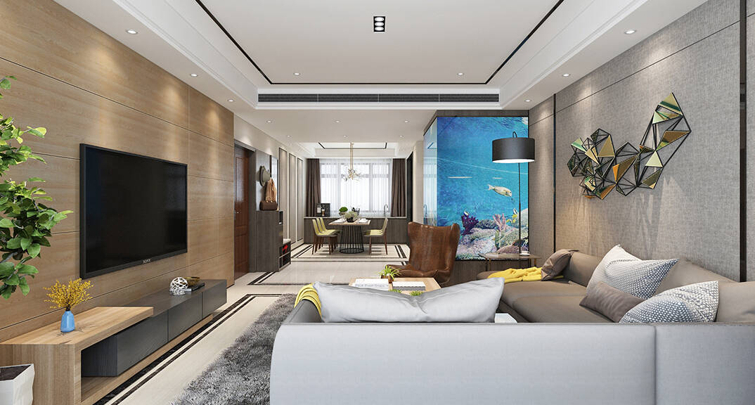 本案以现代港式风格设计,进门的鱼缸在静止的空间中平添了一份灵动靓丽的风景线。