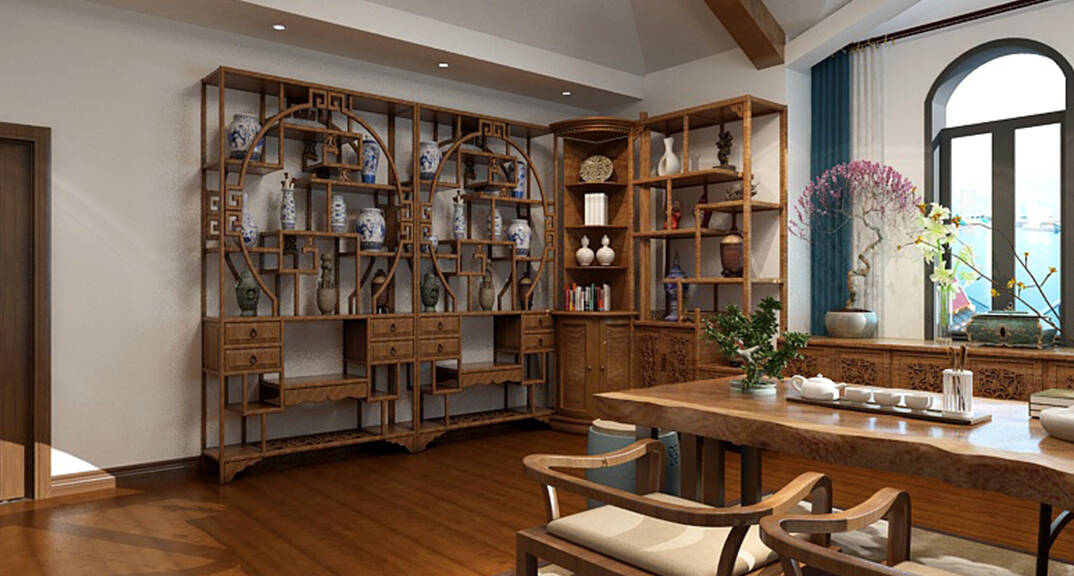 海川泓久山墅635㎡别墅收藏室新中式风格装修案例效果图