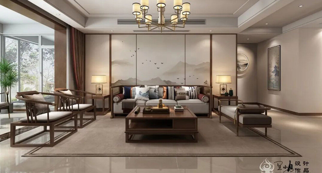 悦湖湾300㎡别墅客厅沙发新中式风格装修案例效果图
