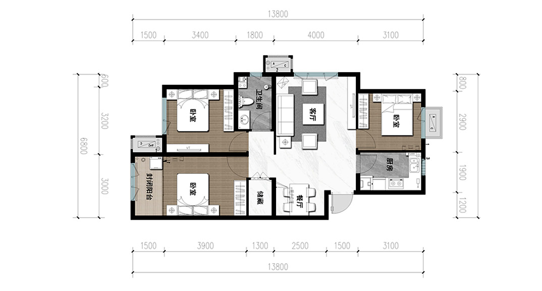 保利时代110㎡三室两厅次卧现代风格装修案例效果图