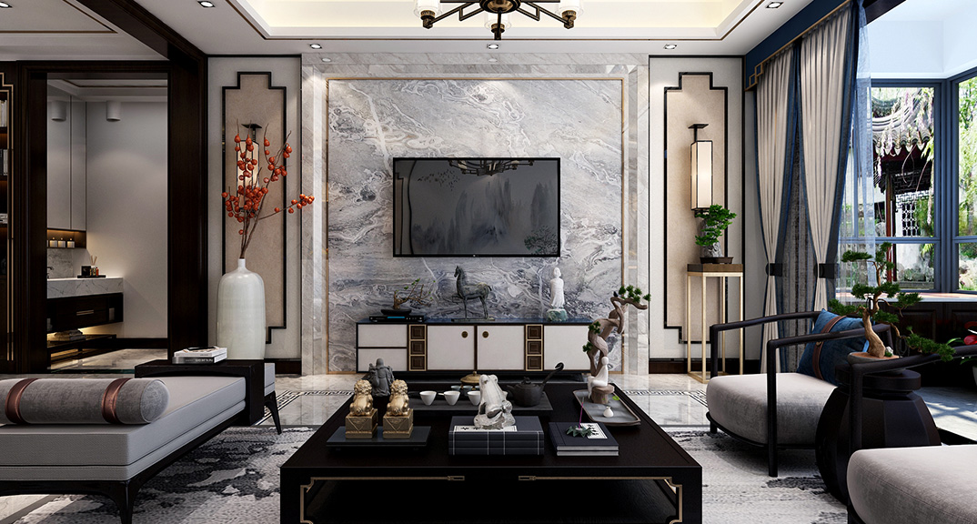 安泰名筑190㎡四室两厅客厅电视新中式风格装修案例效果图