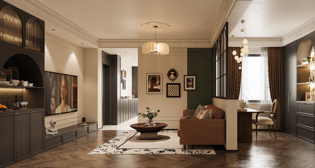 客户需要书房,考虑到客厅的尺寸,决定在沙发上后侧作为独立的读书区,既能中和沙发和电视之间的距离,也可以增加空间的趣味性,用玻璃间隔做到了隐私性和透光性同时兼顾。